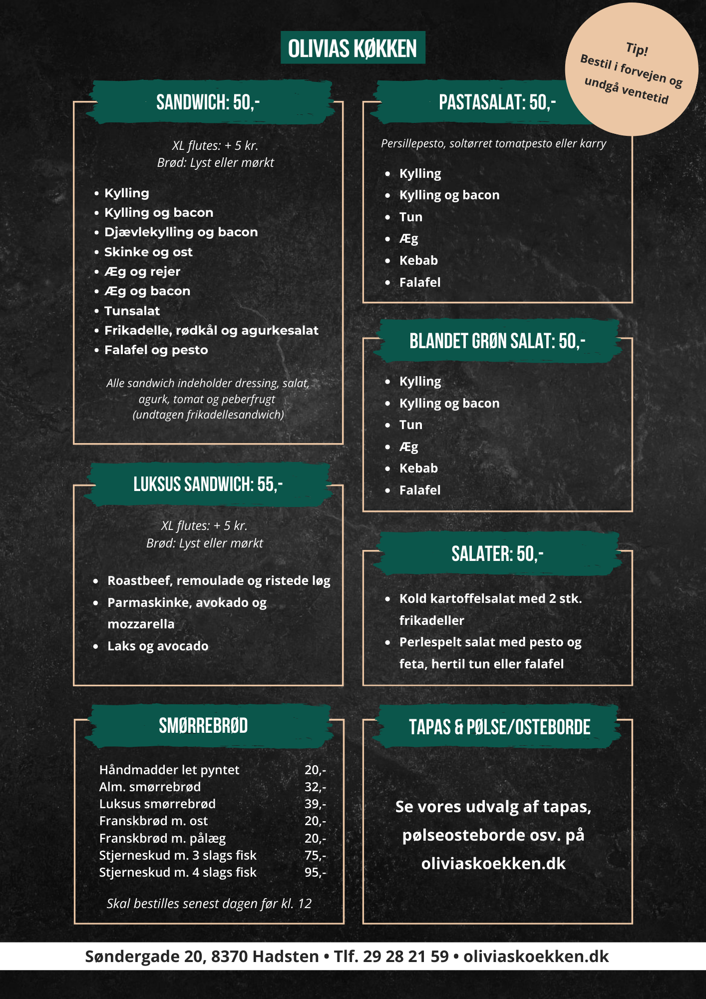 På Søndergade 20 i Hadsten finder du vores lille butik, hvor vi bl.a. tilbyder et udvalg af sandwiches, salater og andre lækre frokostretter. Det er også her, du kan afhente mad, der er bestilt via vores hjemmeside. Butikken tilbyder kun takeaway og har desværre ingen siddepladser.